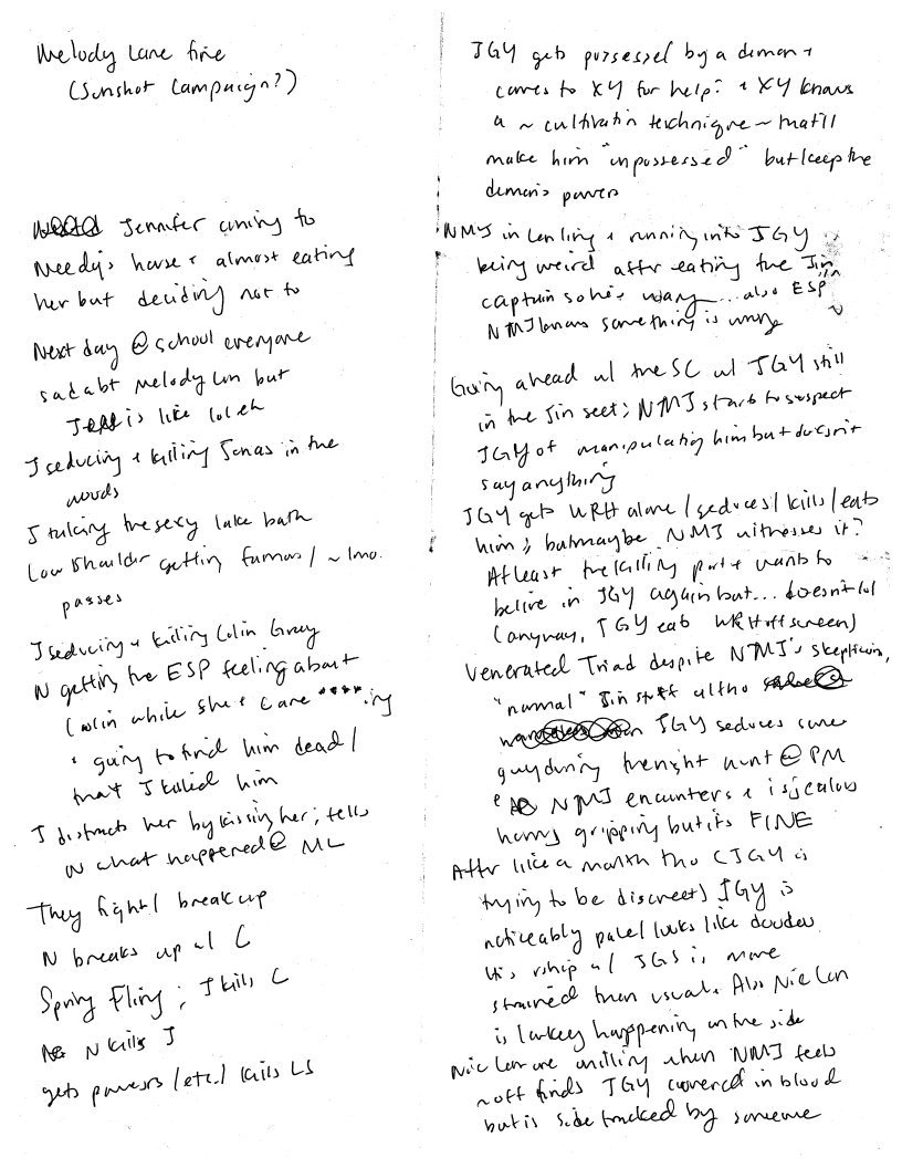 It's in columns because on the left column, I put the beats of Jennifer's Body I wanted to follow (not A Lot, as you can tell) and what my-fic equivalent of that that would be. Of course, I also added transitions to how to get from one point to the next, which is why the right side is so much more substantial. And also, I did fold it up although I realize the scan didn't really show the creases, lol. I wrote this all at work. I also scanned this all at work. My coworker saw me writing something while I was writing it and was like "what's that" and I was like "uhhhh a story idea" and she was like "lol dw I'm on Archive Of Our Own" but I managed to deflect the convo and she ended up telling me she reads Read Dead Redemption 2 fic. LOL.